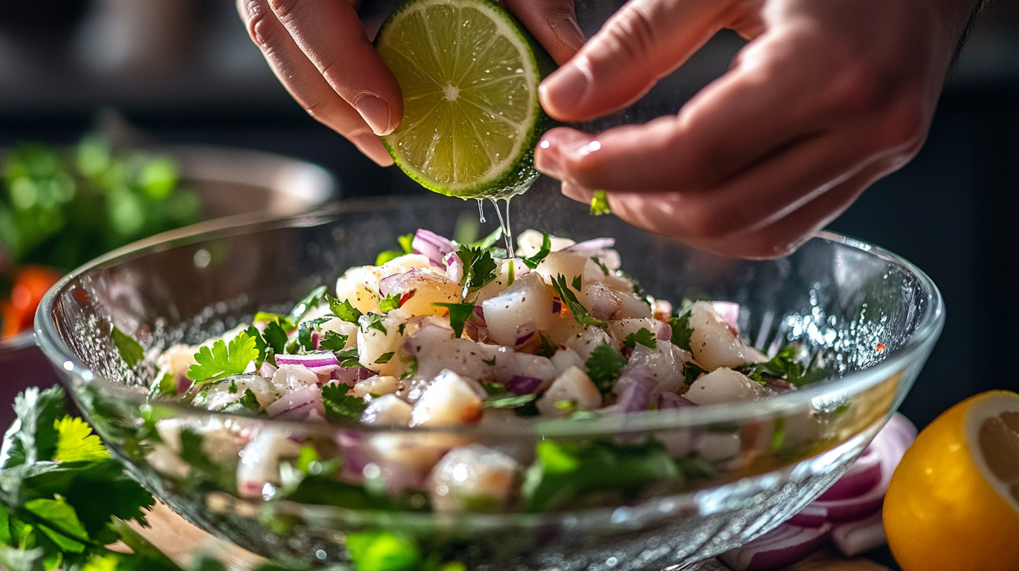 - Vérification de la cuisson : Après la marinade, le poisson doit avoir changé de couleur, passant du translucide à l’opaque. C’est le signe qu’il est “cuit” par l’acidité des agrumes.
