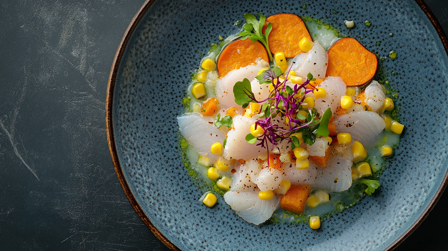 - Dressage : Dans des assiettes creuses ou des bols, disposez le ceviche à l’aide d’une écumoire pour ne pas trop l’inonder de jus. Ajoutez quelques tranches de patate douce et des grains de maïs autour.