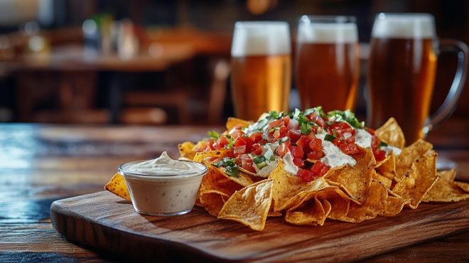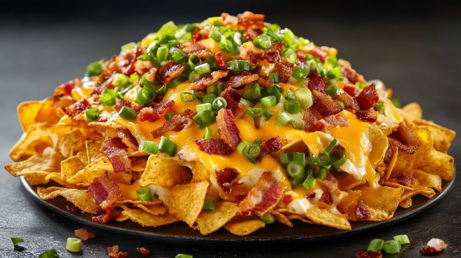 Servez ces nachos dans un grand plat en terre cuite préchauffé pour maintenir la chaleur plus longtemps. Accompagnez d’une salade de tomates et d’avocats pour apporter fraîcheur et équilibre à ce plat réconfortant. Pour une touche finale, garnissez de quelques feuilles de coriandre fraîche et proposez des quartiers de citron vert pour ceux qui aiment ajouter une note d’acidité. Ces Nachos Croustillants au Fromage et Bacon ne sont pas qu’un simple en-cas, c’est une expérience gustative à part entière qui ravira vos convives lors de vos soirées entre amis ou devant un bon film.