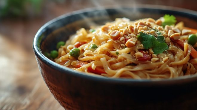 - Finition : Retirez le wok du feu. Incorporez la moitié des cacahuètes concassées et la coriandre fraîche. Mélangez une dernière fois.