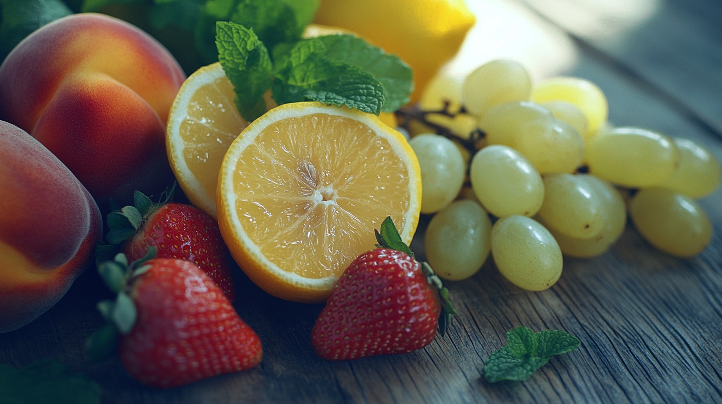 - Préparation des fruits : Lavez soigneusement tous les fruits. Coupez les pêches et les fraises en quartiers, le citron et l’orange en fines rondelles, et divisez les raisins en petites grappes.